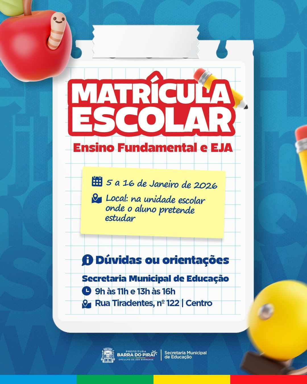 Se preparando para o ano letivo de 2026, a Prefeitura de Barra do Piraí, por meio da Secretaria Municipal de Educação, anuncia que o período de matrícula escolar para o Ensino Fundamental e para a Educação de Jovens e Adultos (EJA) ocorrerá entre os dias 5 e 16 de janeiro.