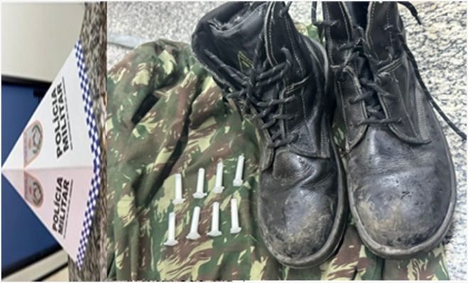No fim da noite, um adolescente de 17 anos foi apreendido por tráfico na Avenida Polastre, no bairro Água Comprida. Na ação os agentes encontraram oito tubos de cocaína, uma blusa militar e um par de botas. Ele estava acompanhado de outro menor, de 15 anos, também levado para a delegacia, mas liberado. (Fotos: PM/Divulgação)