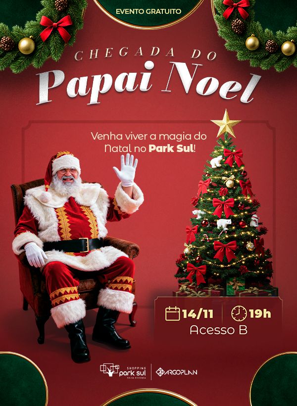 O Shopping Park Sul, em Volta Redonda, comunicou, nesta quinta-feira (6), que a chegada do Papai Noel está marcada para o próximo dia 14 (sexta-feira), a partir das 19h do Acesso B do empreendimento, em frente à loja da Havan. Segundo o Park Sul, a chegada do Bom Velhinho marca oficialmente a aberto do período natalino no shopping.