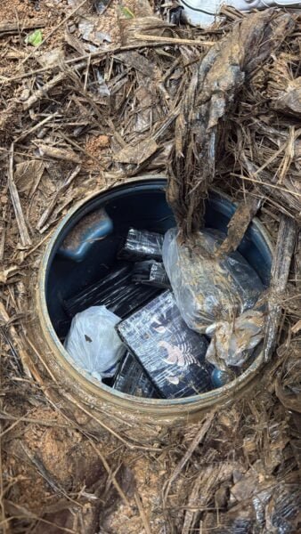 No quintal da residência, os policiais localizaram dois tonéis com diversos tabletes de maconha e cocaína, reforçando a suspeita de que o local funcionava como uma verdadeira refinaria de drogas utilizada pela organização criminosa.