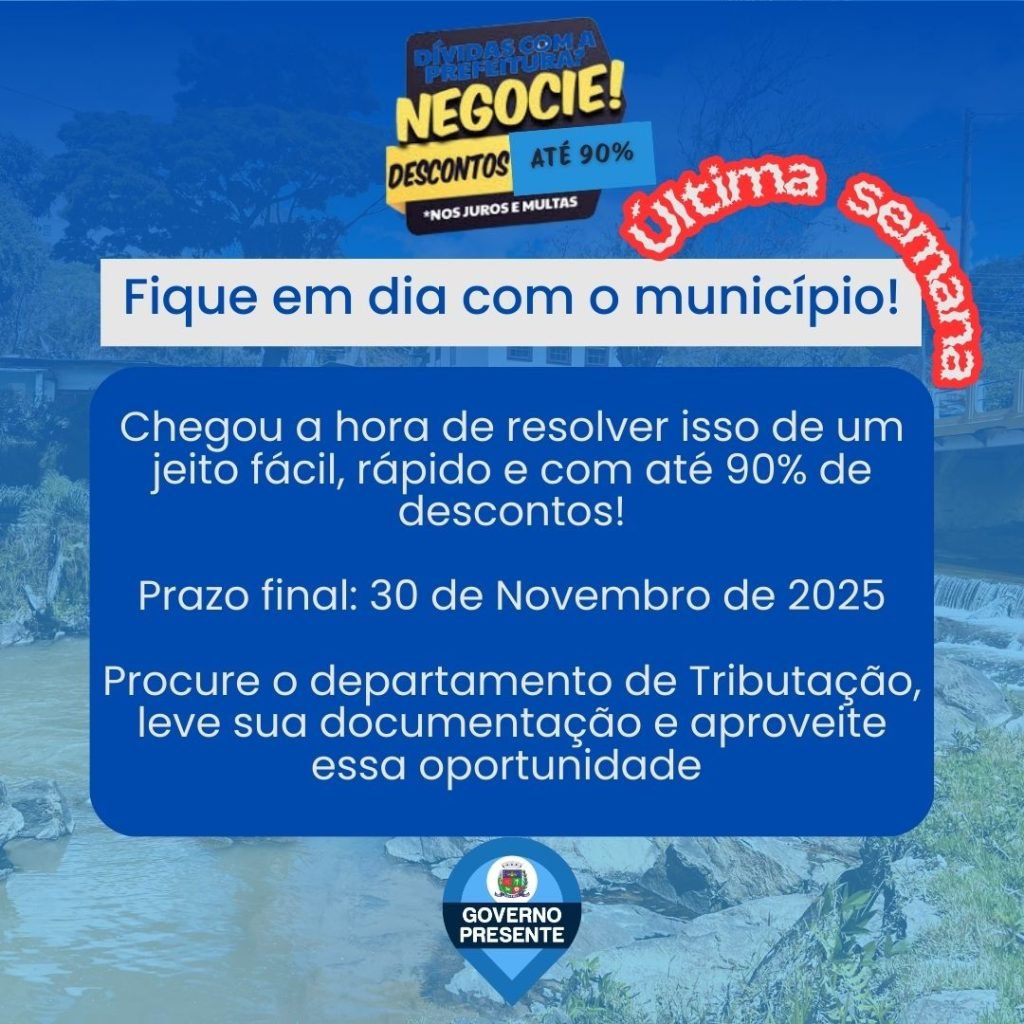 A Prefeitura de Valença / Governo Presente alerta os contribuintes para a última semana de negociações de dívidas municipais com descontos que podem chegar a 90% sobre juros e multas. O prazo final para adesão é 30 de novembro de 2025.