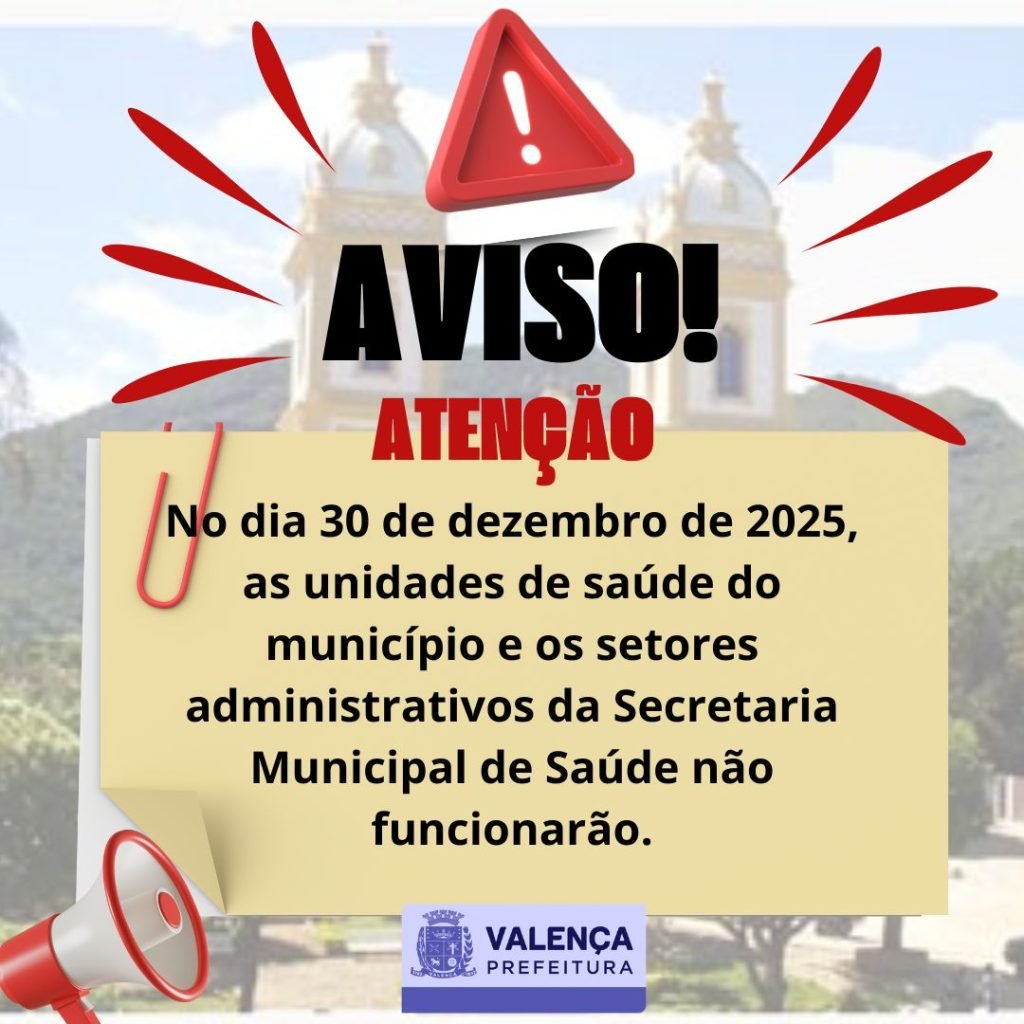 A Prefeitura de Valença / Governo Presente, por meio da Secretaria Municipal de Saúde, informa que no dia 30 de dezembro de 2025 não haverá funcionamento das unidades de saúde do município, incluindo os setores administrativos da Secretaria.